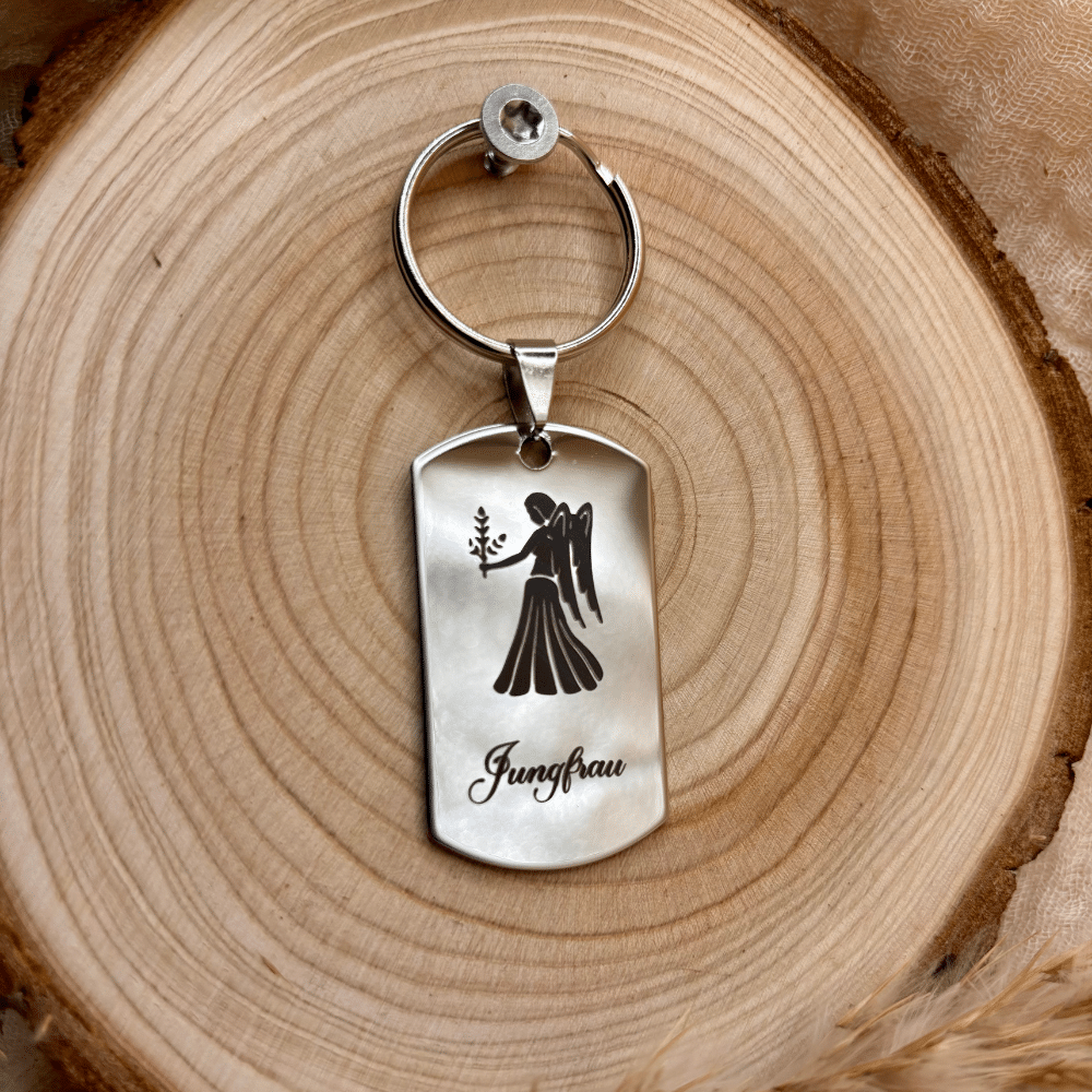 Dank der hochwertigen Gravur bleibt das Motiv dauerhaft klar und präzise sichtbar. Der Anhänger ist sowohl für Damen als auch für Herren geeignet und lässt sich vielseitig kombinieren – ob an einem Schlüsselbund oder als besonderes Geschenk für einen Jungfrau-Geborenen.