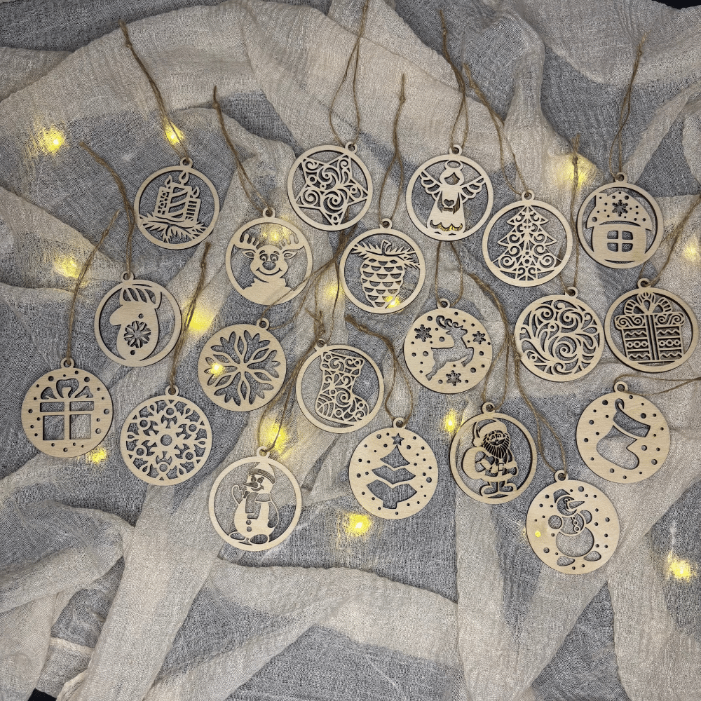 Dieses liebevoll gestaltete 20-teilige Ornamente-Set aus Holz bringt festliche Eleganz in dein Zuhause. Ob am Weihnachtsbaum, an Zweigen, Geschenken oder als Tischdeko – die feinen Weihnachtsmotive sorgen für eine warme, stilvolle Atmosphäre in der Adventszeit.